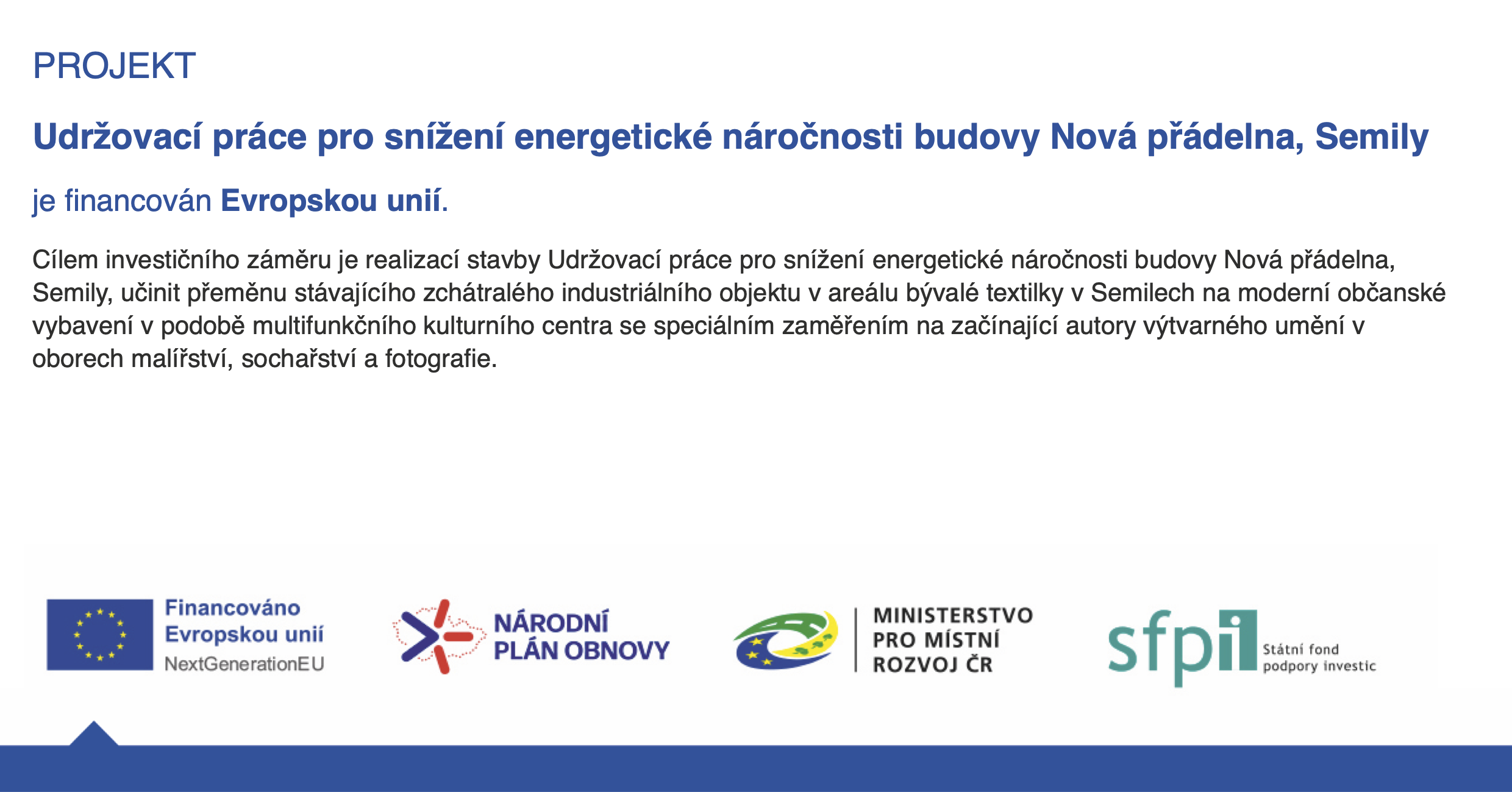 Realizací projektu Nová přádelna dojde k zachování výjimečné industriální stavby s cílem vybudovat multifunkční centrum určené zejména pro kulturu. Díky tomu bude trvale docházet k pozitivním synergickým efektům, kdy se kulturní centrum bude nacházet ve výjimečném objektu a výjimečný objekt získá smysluplné využití.